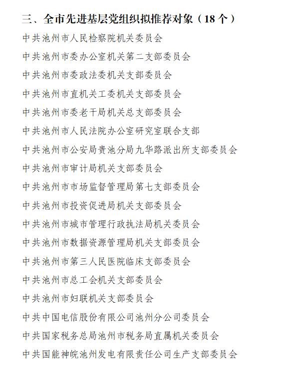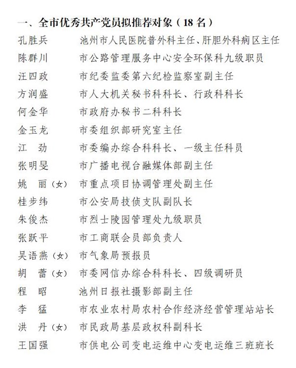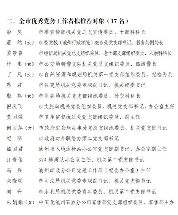 在中国共产党成立100周年之际,市委决定,以市委名义表彰池州市优秀共产党员、池州市优秀党务工作者和池州市先进基层党组织。按照市委办公室通知要求,在市直各基层党组织推荐的基础上,通过严格考察、综合比较,市直工委提出池州市“两优一先”拟推荐对象。为充分发扬民主,广泛接受监督,现将推荐对象名单予以公示(排序不分先后)。