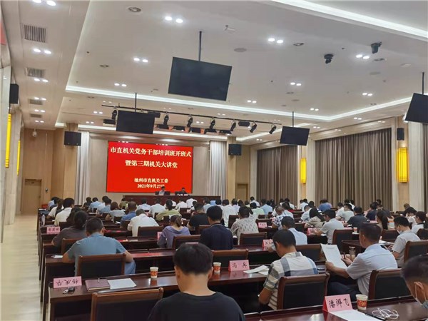9月27日,2021年度第三期市直机关大讲堂在市委党校会议中心开讲。工委直属基层党组织负责人、工委机关党员干部共计120余人到会聆听,市直工委副书记查正东主持会议。