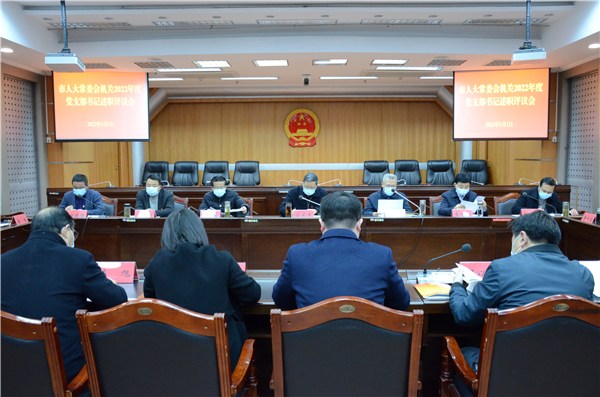 3月1日,市人大常委会机关党总支召开2022年度党支部书记抓党建述职评议会,研究部署2023年机关党建工作。市人大常委会主任金庆丰,市人大常委会副主任朱鸿、李用林,一级巡视员夏吉苗和市人大常委会秘书长王枞红参加会议。