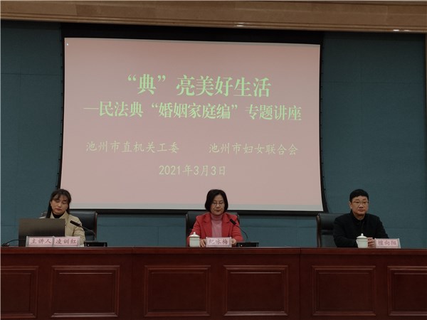 为迎接第111个“三八”国际妇女节,3月3日,市直工委与市妇联共同举办“典”亮美好生活—民法典“婚姻家庭编”专题讲座。市直各单位妇委会主任及部分妇女代表共80余人现场聆听,市妇联副主席纪咏梅主持,市直工委副书记檀向阳参加讲座。