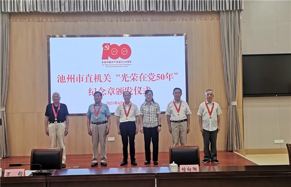 会上,万钧向“光荣在党50年”获颁者代表发放了纪念章。“光荣在党50年”获颁者及新党员代表分别发言,表达了对党的热爱、感激和祝福之情,表示要更加坚定对共产主义的信仰,坚定永远跟党走的信念。会议要求市直机关广大党员干部传承好发扬好老党员老前辈们的光荣传统,立足新发展阶段、贯彻新发展理念、构建新发展格局,奋力谱写新阶段现代化“三优池州”建设新篇章,以优异成绩庆祝建党100周年。