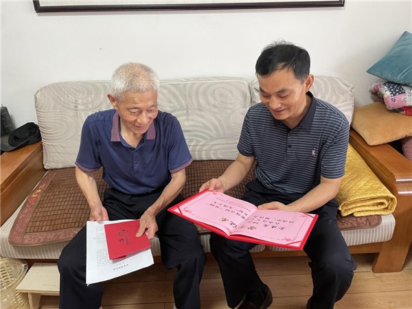 6月23日上午,市公安局组织开展“光荣在党50年”纪念章颁发活动。此次活动,以上门走访的形式开展。市局党委委员、政治部主任方斌分别为入党50周年党员颁发纪念章,向老党员长期以来为池州公安工作作出的重要贡献表示衷心感谢和崇高敬意,并向老党员送去诚挚的问候。