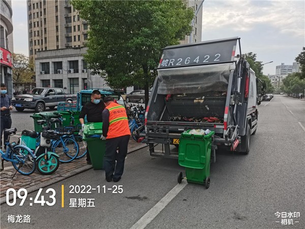 (市城管局环卫处志愿者配合做好生活垃圾进行清运消杀工作)