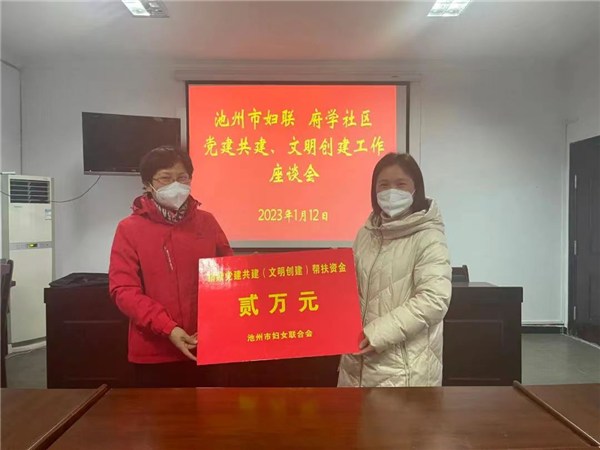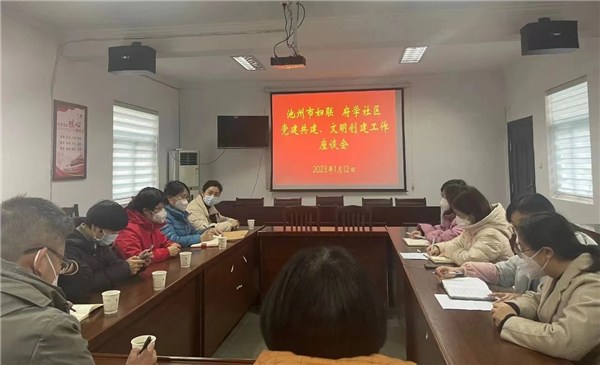 在贵池区清风街道府学社区党员活动室,市妇联一行与社区两委干部开展党建共建(文明创建)座谈交流,认真听取社区党委负责人关于2022年度党建和文明创建工作特色亮点及2023年工作思路打算等情况介绍,详细了解当前社区居民反映的热点难点问题,共同谋划推进问题解决的对策。